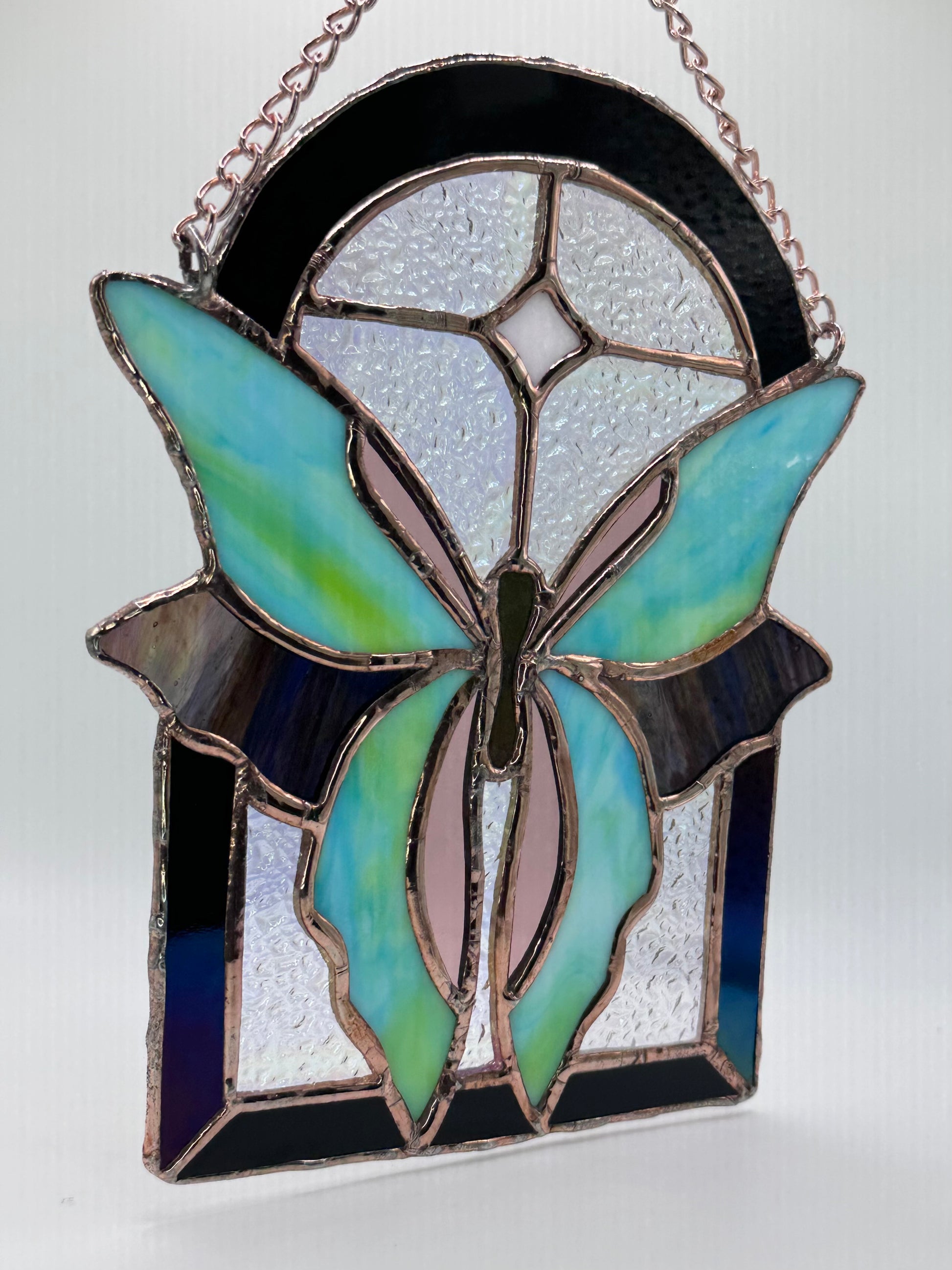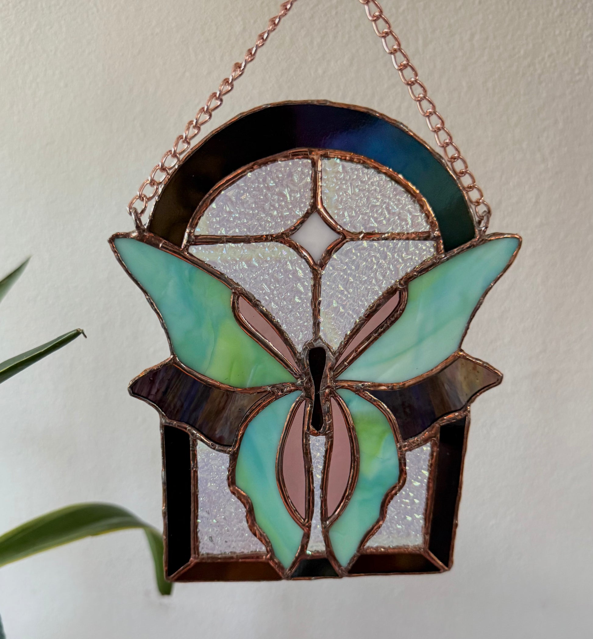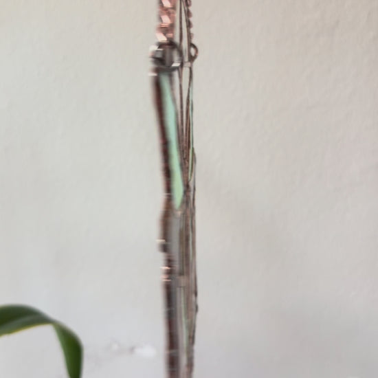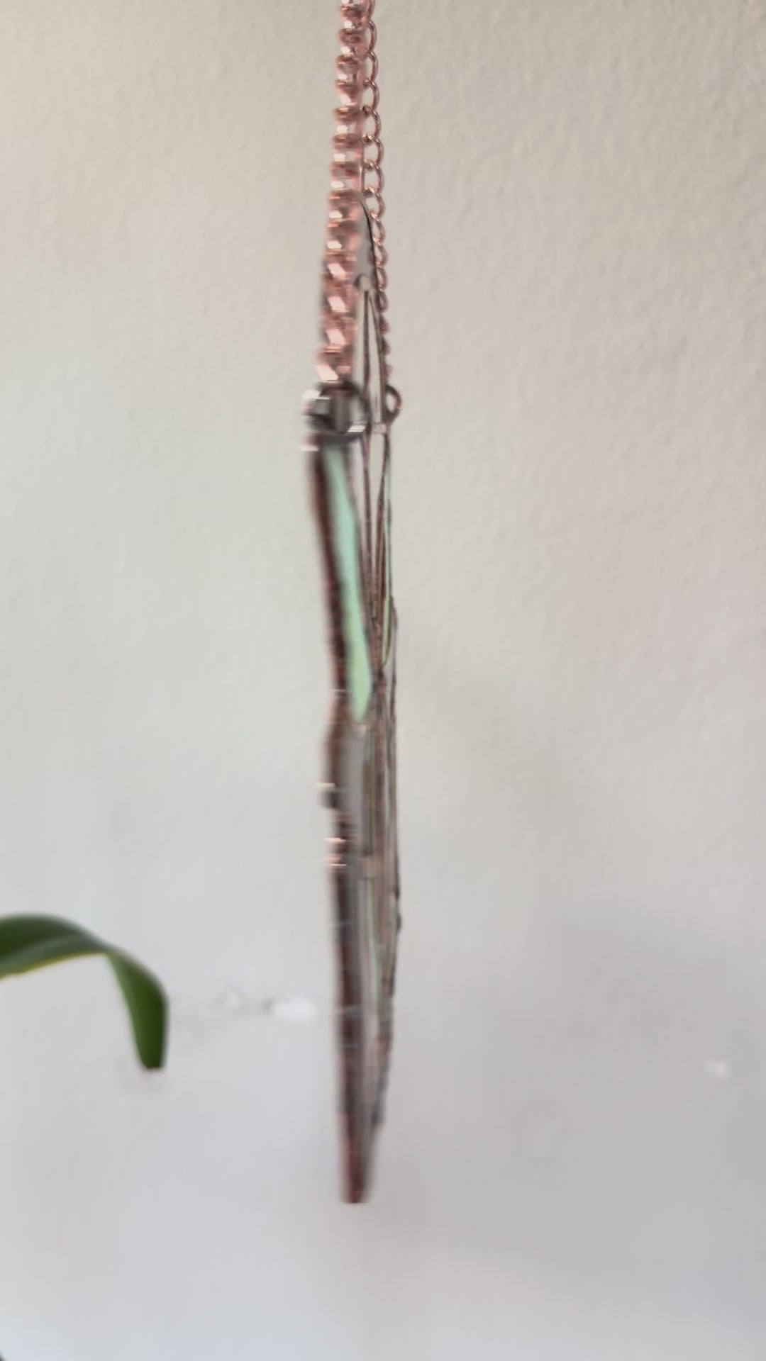 - Glass, copper foil, solder, patina, metal chain