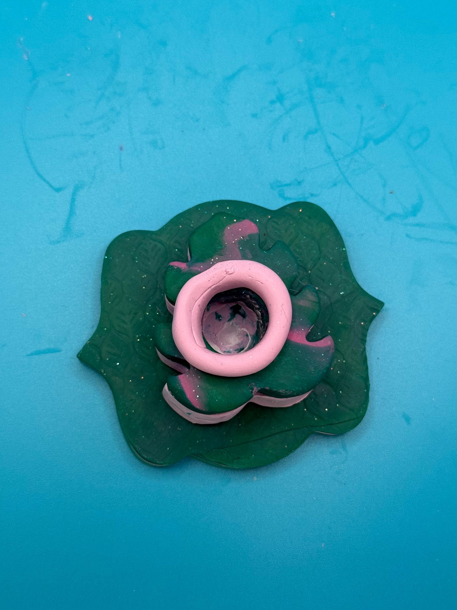 Crafted with love (and a little bit of clay magic), it features a green base with a pink monstera layer stacked on top—like a houseplant that decided to get fancy for dinner. Topped with a pink ring to hug your candle tight, this holder doesn’t just sit pretty—it holds its ground. And yes, it comes with that gorgeous lilac taper candle you see, because we’re all about delivering the full vibe.