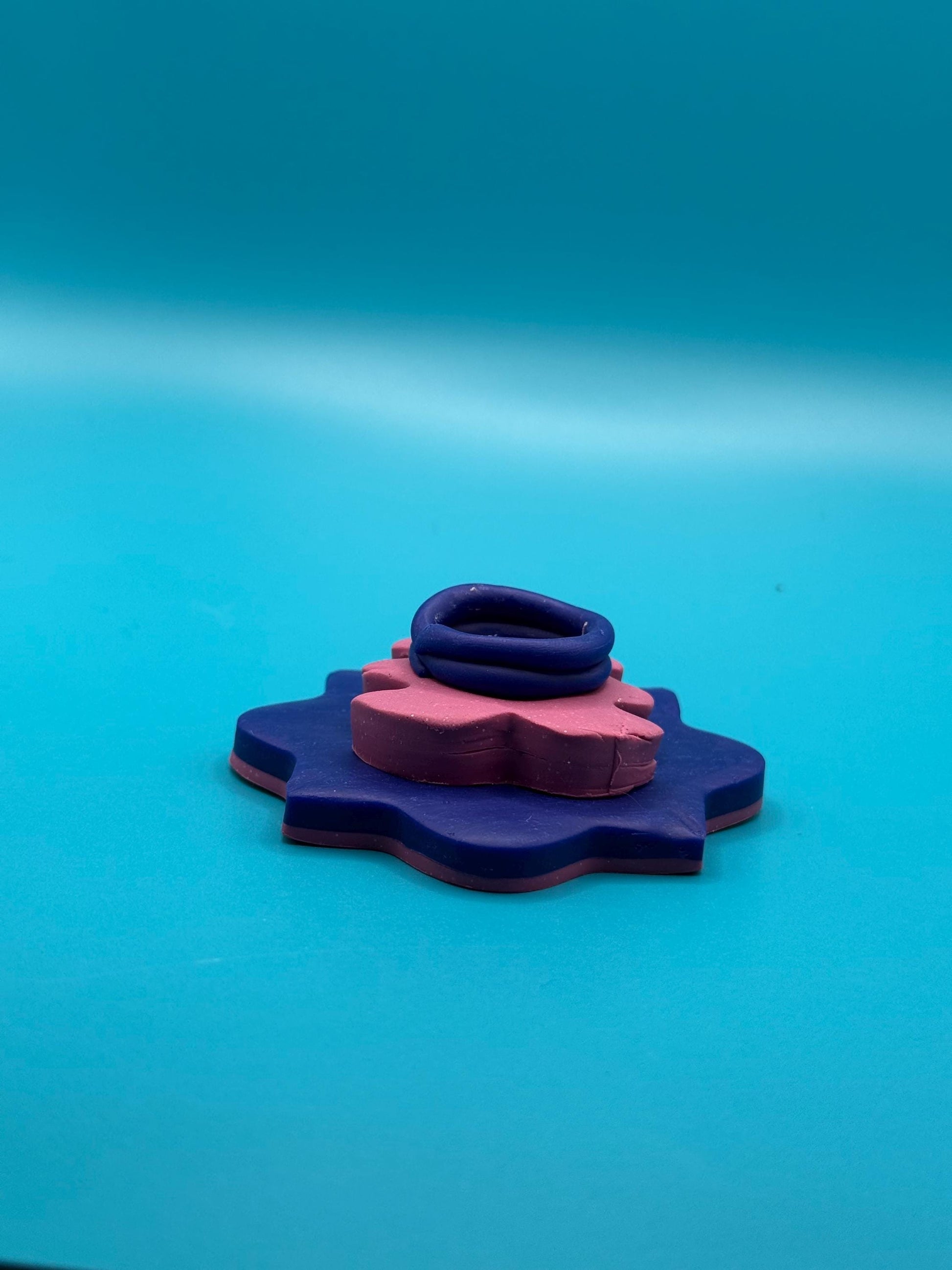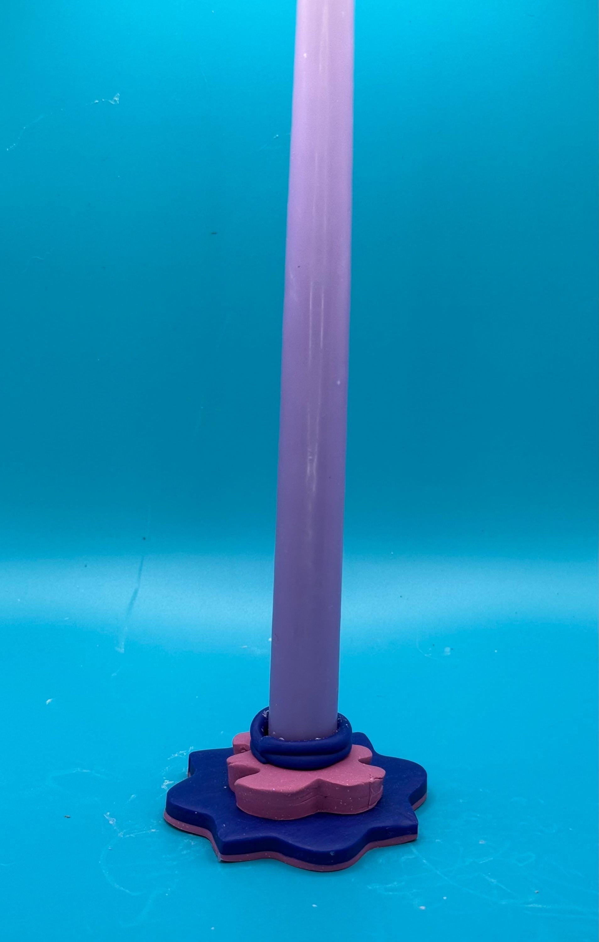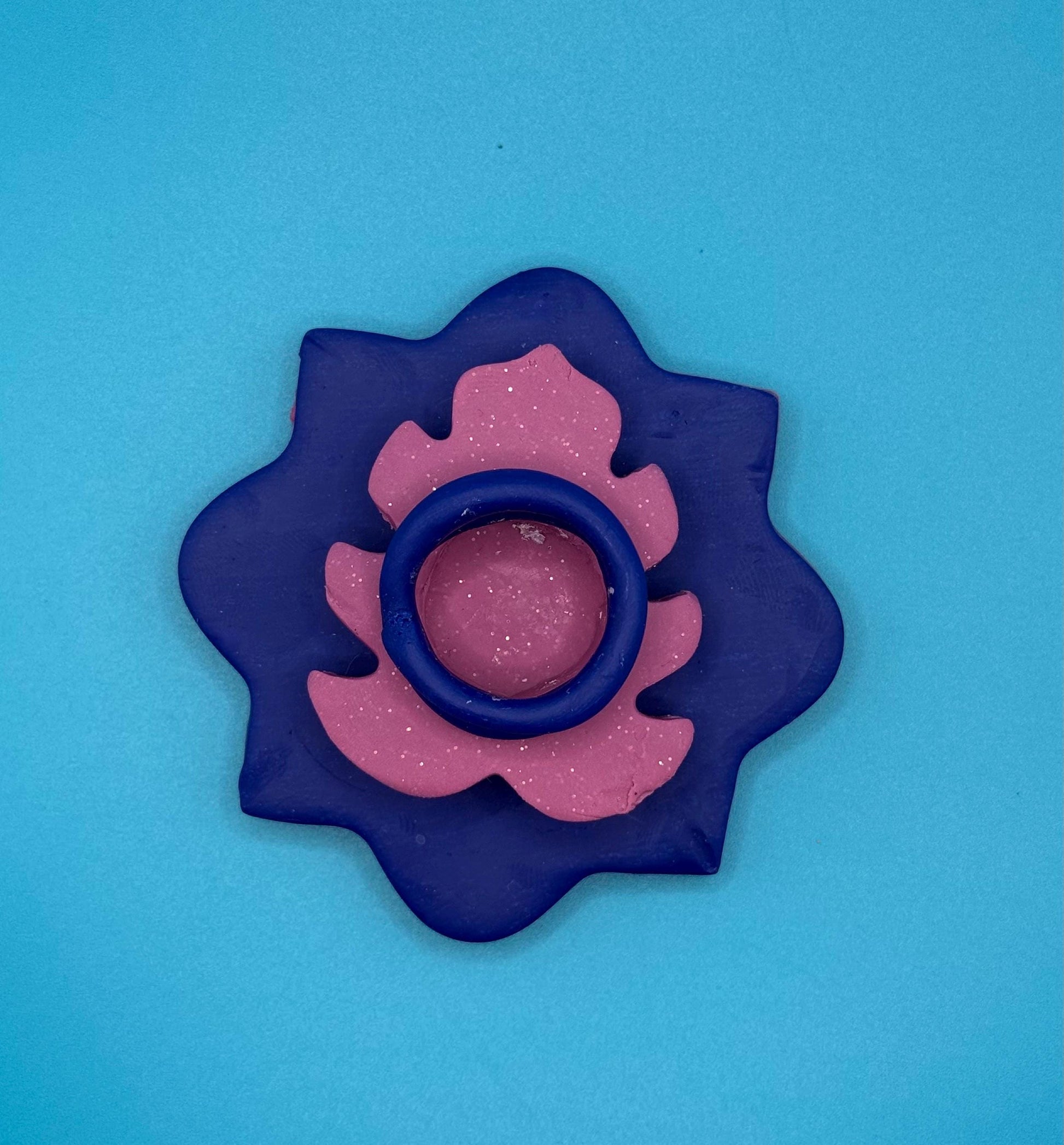 Crafted with love (and a little bit of clay magic), it features a navy-blue base with a pink monstera layer stacked on top—like a houseplant that decided to get fancy for dinner. Topped with a bold blue ring to hug your candle tight, this holder doesn’t just sit pretty—it holds its ground. And yes, it comes with that gorgeous lilac taper candle you see, because we’re all about delivering the full vibe.