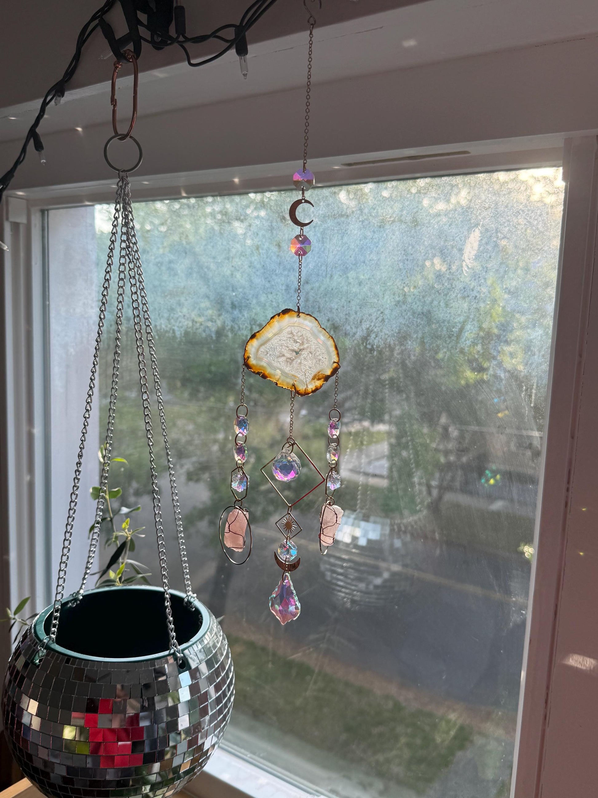 Infuse your space with light, love, and celestial magic with this handmade suncatcher, featuring a raw wire-wrapped rose quartz and the mystical Agate of a Thousand Wishes.