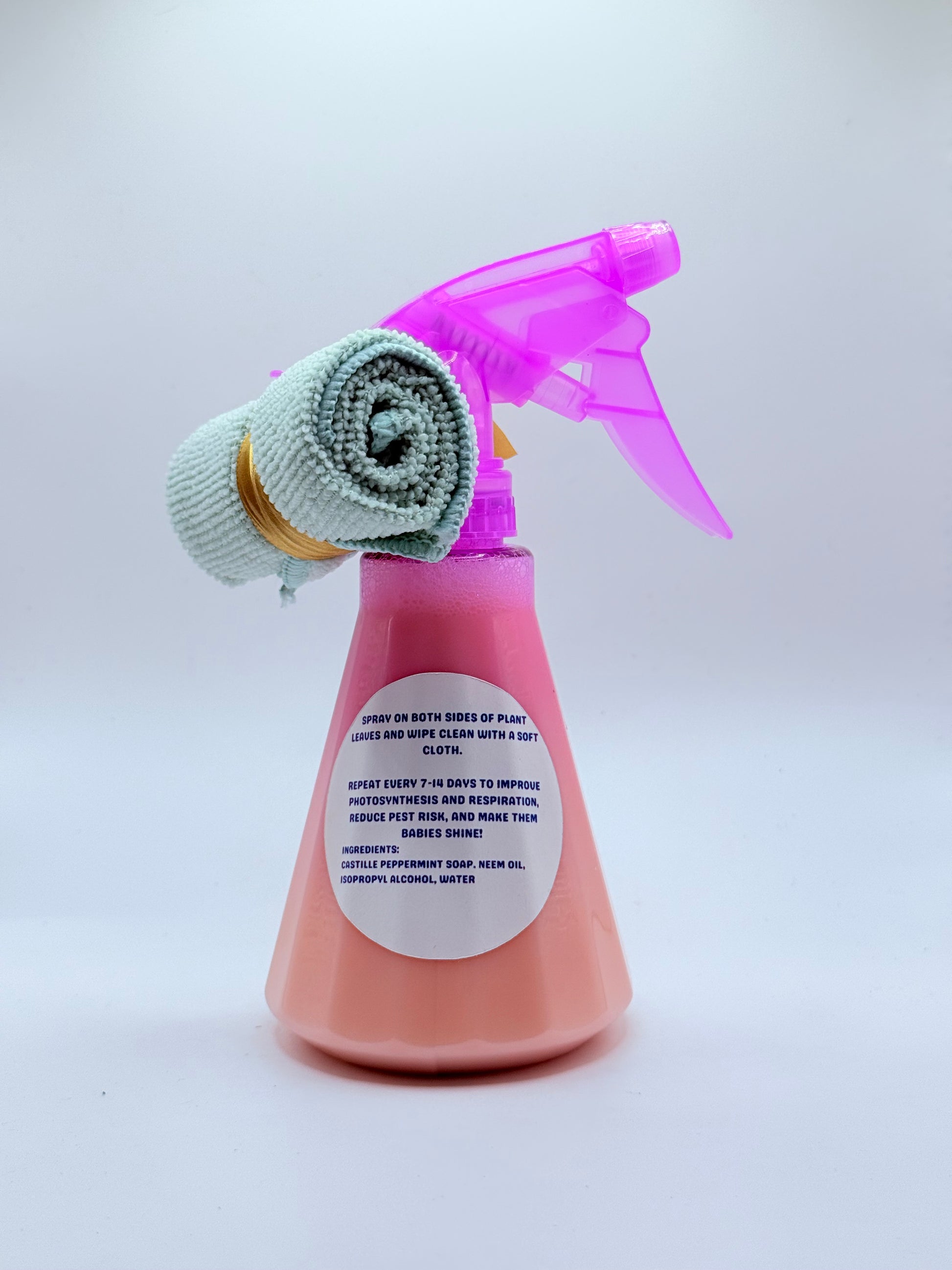 Spray this on both sides of their leafy faces, wipe clean with something soft (like the microfiber cloth that’s included) and repeat every 7–14 days. Why? Because it helps them breathe better, photosynthesize like champs, dodge pests, and, yes, shine like they’re headed to prom.